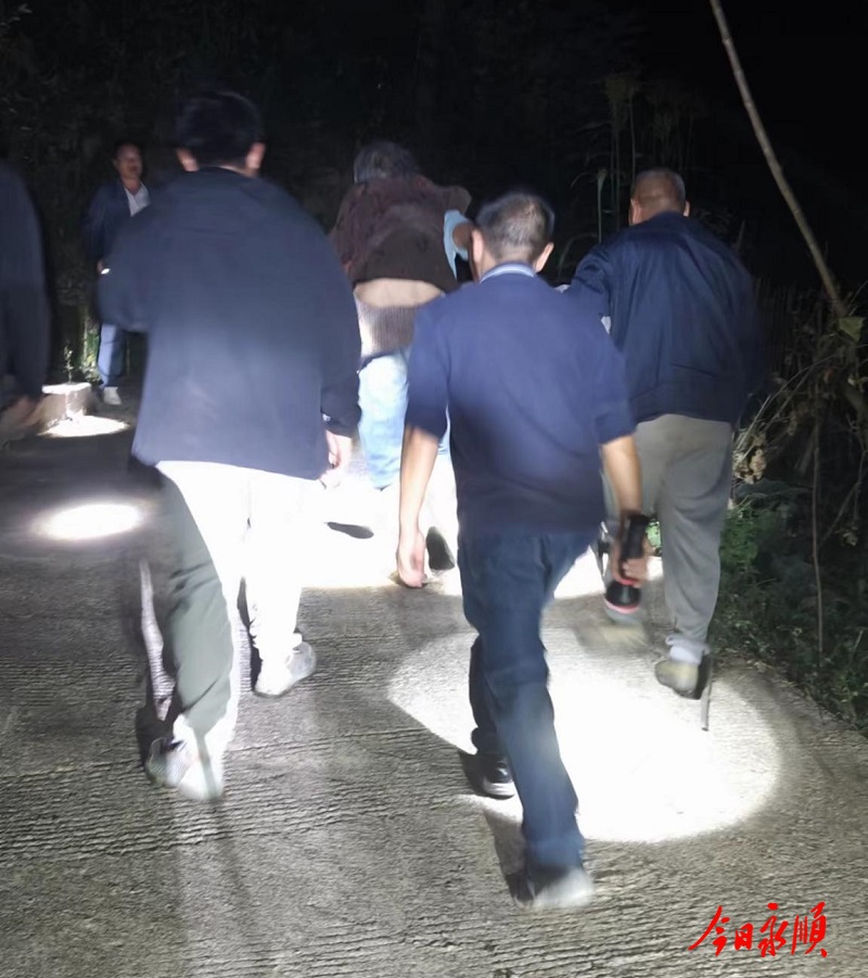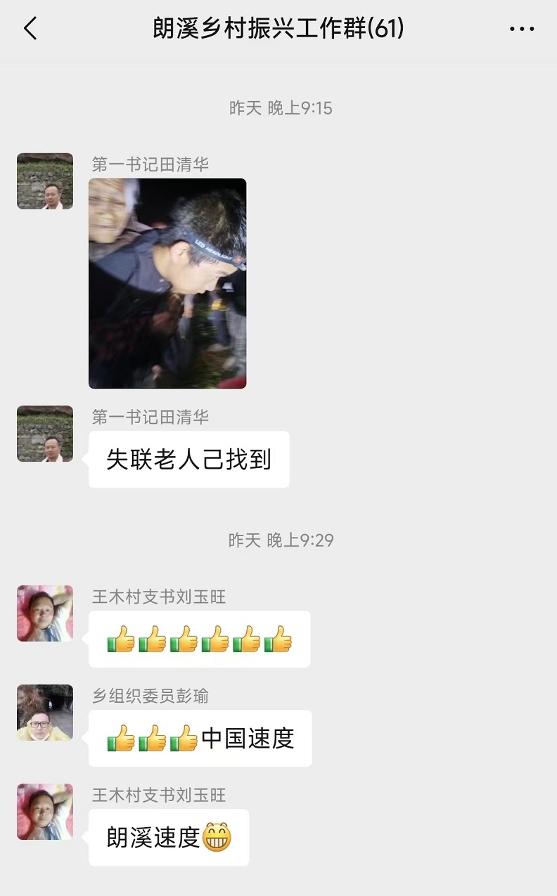 当天晚上19时50分,该乡值班人员接到驻朗溪村工作队第一书记田清华电话,称朗溪村有村民反映申请帮助寻找其百岁母亲。据了解,原来其母亲常住于黄洞村,现今101岁,于9月24日下午一两点外出捡柴,至今失联。值班人员立即上报,并联系黄洞村核实相关情况,了解到当前黄洞村委已安排村干部与在家村民通过查监控、沿老人常走路线开展寻人。该乡相关负责人分析研判,通知家属向派出所报案,并组织人员携带通讯、照明等设备驾车前往走失地,加入寻人行动。直至21时15分,朗溪乡干群一行人在某陡坡处找到走失老人,老人因摔伤无法行走。随后,家属与该乡干部们立即将老人背至马路上,并送往乡卫生院住院治疗观察。
