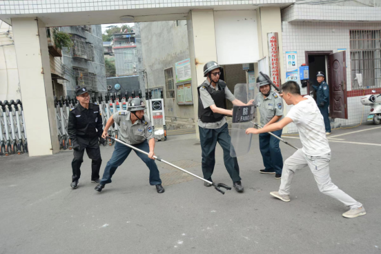 上午11点,该校利用课间操时间,模拟一名“歹徒”手持棍棒强行闯入学校,安保人员使用防暴钢叉、防暴盾牌、警棍等与“歹徒”展开周旋,最终成功地将“歹徒”制服,并将其快速带离现场,及时排除了险情。在操场上活动的学生也发现“险情”,迅速撤离,到达安全区域。