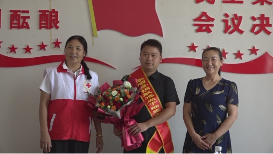 图为永顺县红十字会及县教体局相关负责人为张伟赠送鲜花和绶带